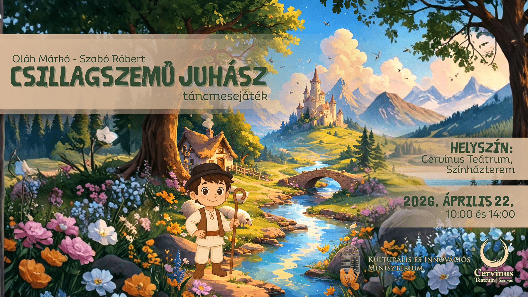 Home Eseménytár A Csillagszemű juhász A Csillagszemű juhász + Google Naptárba mentés + iCal / Outlook export 00 Nap 00 óra 00 perc 00 másodperc dátum 2026.ápr.22. időpont 10:00 - 00:00 helyszín Cervinus Teátrum 5540 Szarvas, Kossuth Lajos tér 3. Honlap http://cervinushaz.hu/ Kategória Előadás Te is megosztanád?