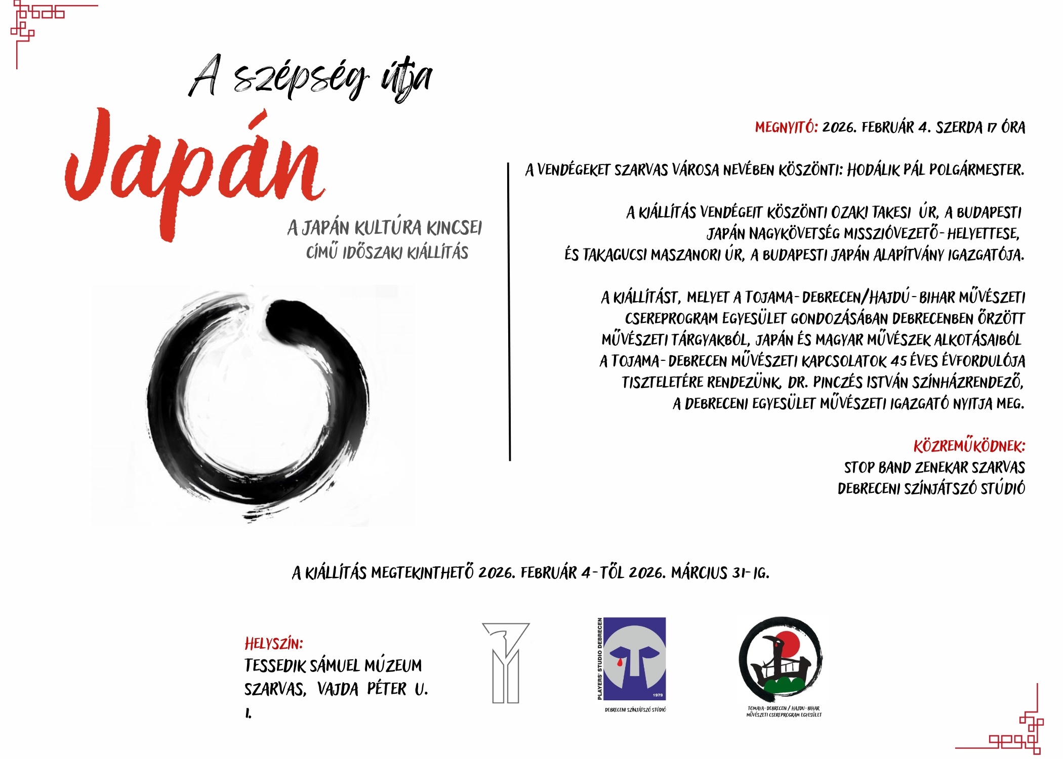 Home Eseménytár A szépség útja, Japán A szépség útja, Japán + Google Naptárba mentés + iCal / Outlook export dátum 2026.febr.04. - 2026.márc.31. JELENLEG TART... időpont 08:00 - 18:00 helyszín Tessedik Sámuel Múzeum 5540 Szarvas, Vajda Péter utca 1. Kategória Programok Te is megosztanád?