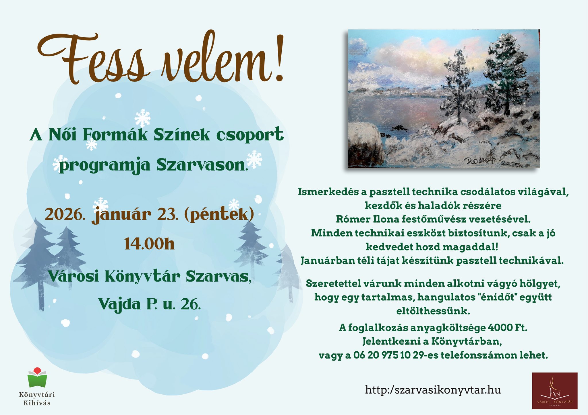 Home Eseménytár Fess velem! Fess velem! + Google Naptárba mentés + iCal / Outlook export 00 Nap 00 óra 00 perc 00 másodperc dátum 2026.jan.23. időpont 14:00 - 17:00 Résztvételi díj 4.000HUF helyszín Városi Könyvtár 5540 Szarvas, Vajda Péter utca 26. Kategória Programok Te is megosztanád?