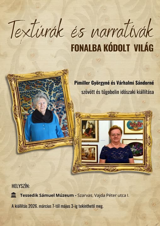 Home Eseménytár Gobelin kiállítás Gobelin kiállítás A kiállításon nemcsak gyönyörű, részletgazdag gobelin munkákat láthatnak az érdeklődők, hanem a gobelin történetéhez, fajtáihoz is közelebb kerülhetnek. Az ünnepélyes megnyitóra 2026. március 7-én (szombat) 15 órakor kerül sor. + Google Naptárba mentés + iCal / Outlook export 00 Nap 00 óra 00 perc 00 másodperc dátum 2026.márc.07. - 2026.máj.03. időpont 17:00 - 18:00 helyszín Tessedik Sámuel Múzeum 5540 Szarvas, Vajda Péter utca 1. Kategória Programok Te is megosztanád?