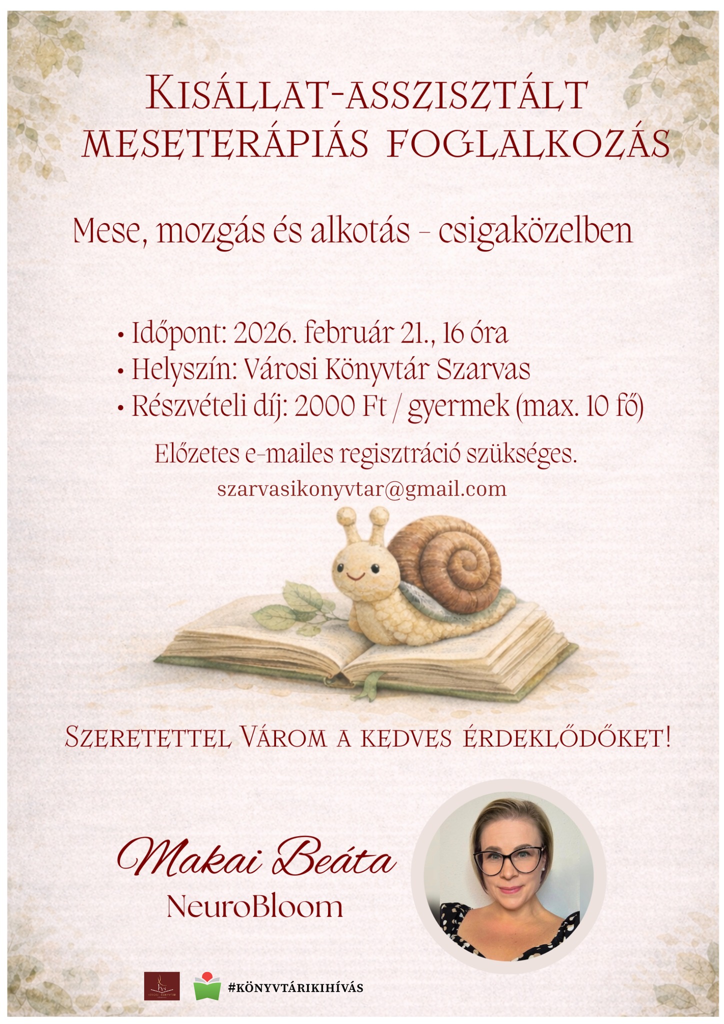 Home Eseménytár Kisállat-asszistált meseterápiás foglalkozás Kisállat-asszistált meseterápiás foglalkozás + Google Naptárba mentés + iCal / Outlook export 00 Nap 00 óra 00 perc 00 másodperc dátum 2026.febr.21. időpont 16:00 - 18:00 Résztvételi díj 2.000HUF helyszín Városi Könyvtár 5540 Szarvas, Vajda Péter utca 26. Kategória Előadás Te is megosztanád?
