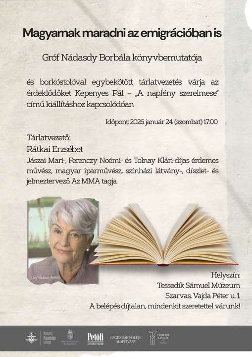 Rendhagyó programra kerül sor a múzeum nagytermében. A rendezvény első részében Gróf Nádasdy Borbála Magyarnak maradni az emigrációban is című kötetének bemutatójára kerül sor, ezt követően pedig borkóstolóval kísért tárlatvezetés várja az érdeklődőket Kepenyes Pál – „A napfény szerelmese” kiállításhoz kapcsolódóan.