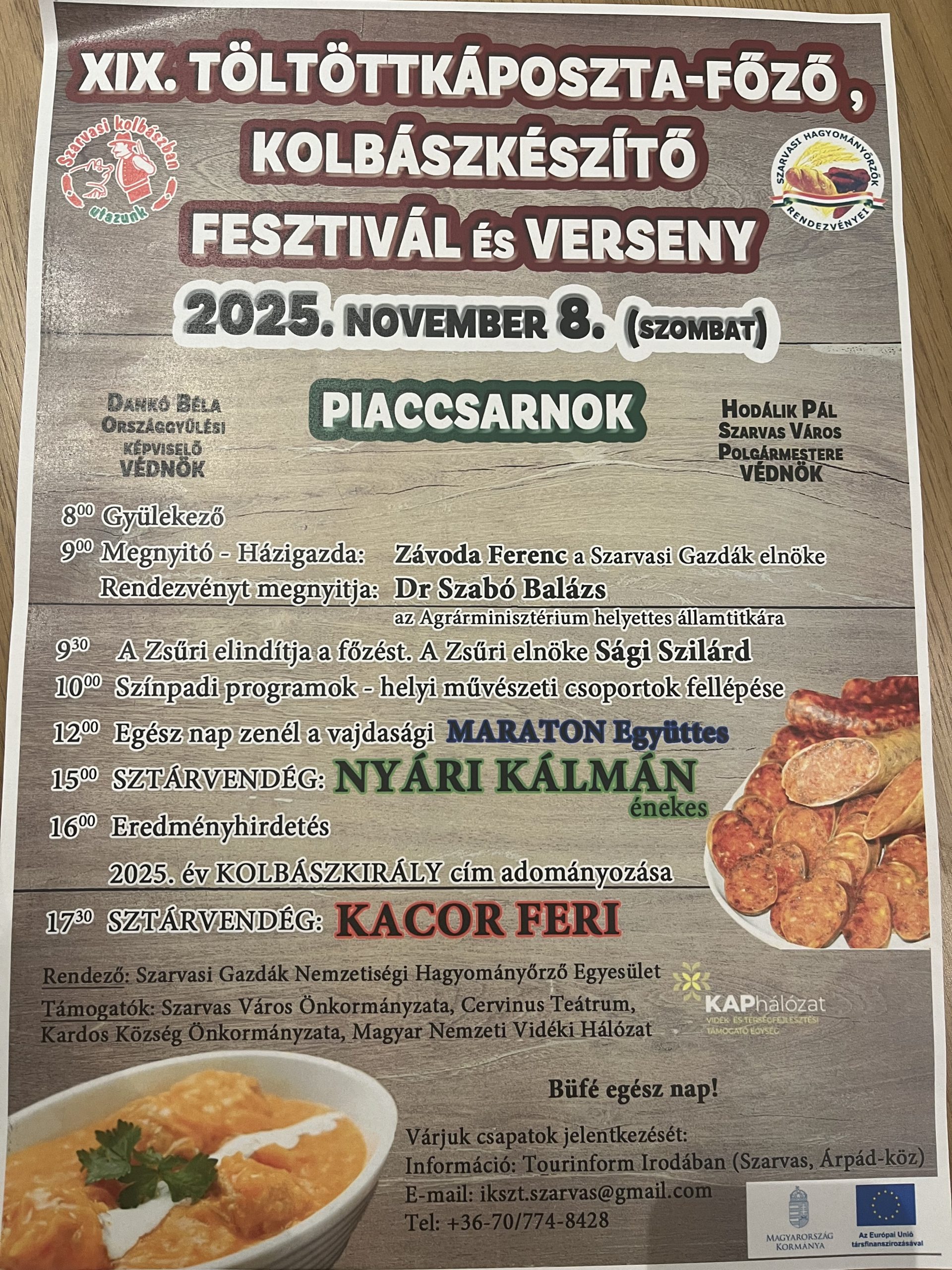 A szarvasi töltött káposzta-főző és kolbászkészítő versenyen összemérhetik tudásukat a résztvevő csapatok 2025. november 8-án. A rendezvény helyszíne a Piaccsarnok. A szervezők várják a csapatok jelentkezését. A gasztronómiai programok mellett vidám zene és színpadi programok, sztárvendégek fellépései várják az érdeklődőket.